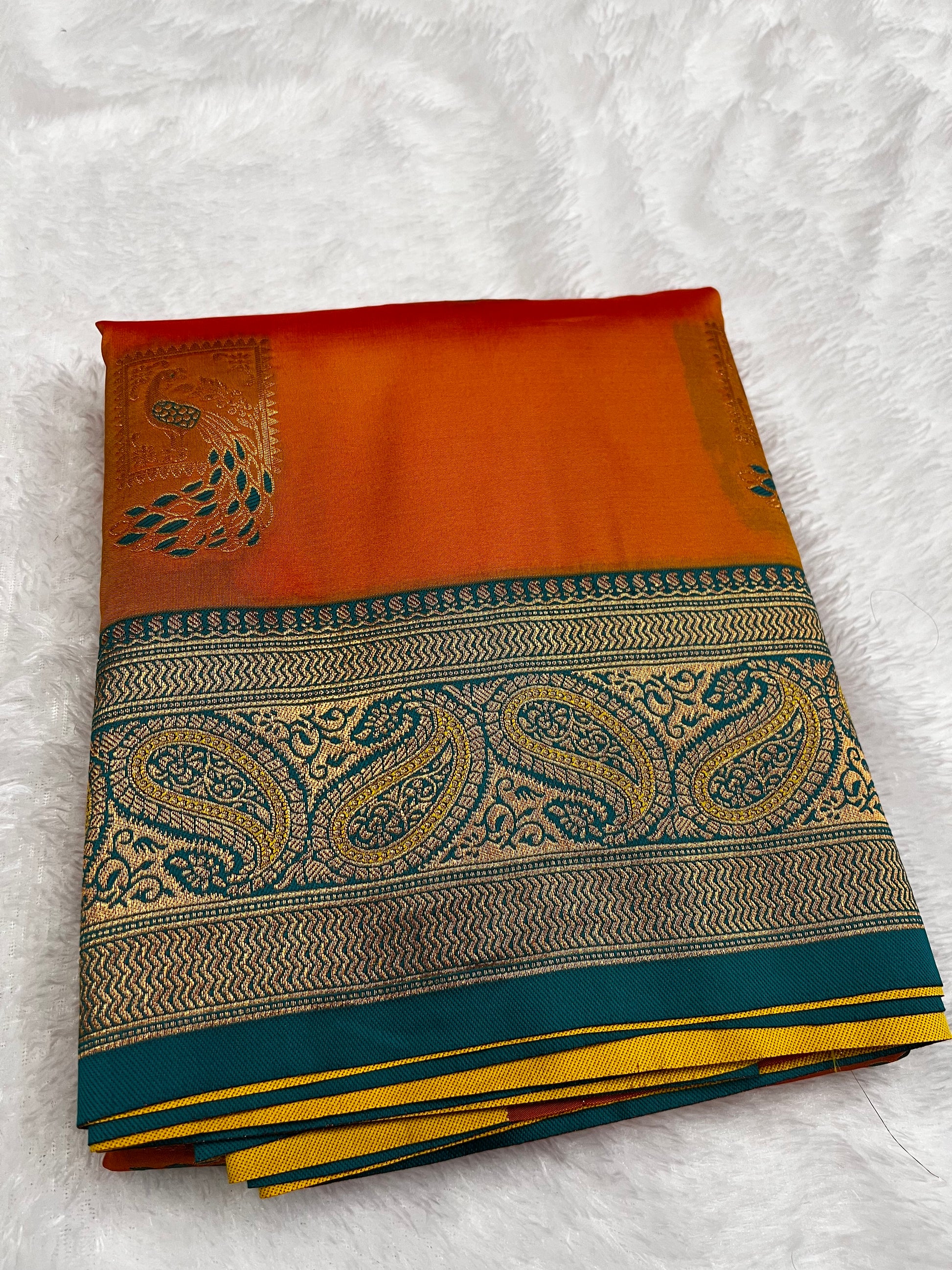 - Work: Zari weaving with detailed peacock motifs across the saree